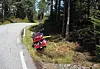 UHELDIG MOTORSYKLIST: Motorsykkelen hamna utfor vegen ved Tveit på Flatråker fredag ettermiddag. Nederst i biletet kan det sjå ut som det er merke etter utforkøyringa, men dette er merke etter kantklypparen som har vore langs Flatråkervegen i det siste.