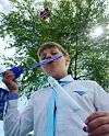 Hans Jakob Dalland Helland lagar såpebobler i strålande sol. (Foto: Johanne Dalland)
