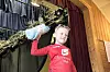 KONFERANSIER: Lars Petter Epland leia stødig utdelinga frå scenen. Med seg på scenen hadde han mange ivrige born, som lurte seg nedover det stappfulle lokalet, for å levera gevinstane til den rette personen.