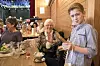 ÅRESAL: Det gjekk fort unna å selja årer til ivrige tysnesingar. Samuel Dalland (t.h.) tar i mot pengar frå Marit Dalland.
