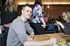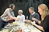 SEKRETARIATET: Lars Petter Epland sit seg ned på litt. Korpsforeldra Rolf Johan Lunde og Torunn Nødland har god kontroll på pengeteljinga. Lena Vermedal (t.v.) kjem med litt forfriskingar.