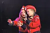 NISSAN: Heldigvis for reisefølgjet, hadde Bromveig (i raudt, spelt av Madelen Hillesvik) ei magisk nissevogn. Dei andre er f.v. Victoria Gjerstad, Iselin Nilsen og Rasmus Hustad.