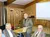 PÅ SOGESODD: Foredragshaldar Harald Sætre flankert dei to sogeskriftredaktørane Olav Skjellevik (t.v) og Mikal Heldal.