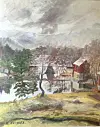 FRÅ UGGDAL: Måleri av Kristoffer Aarskog frå 1953, slik det såg ut frå bakeriet den gongen. (Foto av måleriet: Helge Hystad)