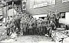 FLYGANSVÆR: Tyske mannskap saman med hunden Rolf framfor ei av barakkene på Flygansvær. Barakka stod omlag der Johannes Bergesen har verkstaden sin i dag. (Foto: Utlånt av Kapabel forlag)
