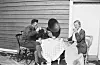 KAFFIPAUSE: Det er litt påskestemning over dette biletet av Lars og Laila Myking som drikk kaffi i solveggen ein stad i Våge. Året er 1921, og på bordet står ein tutgrammofon. (Fotograf: Carl Bjørn Olsen/Ørn Akselsens samling)