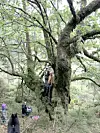 KJEKK TUR: Oppi eika står Magnus Økland og oldebarnet Elise Helland (11). Lillie Ann Ersland-Hamill (5) og hunden Poppy nedanfor, og barnebarn Nina Ersland med sonen Håkon Magnus Ersland-Hamill (2) heilt bakerst i biletet (Alle foto: Mona Lene Ø. Hareide)