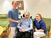 SAMVÆR MED ELDRE: Angelica er ofte innom og snakkar med Harald Rimmereid. Hjelpepleiar Silje Bjørndslen til høgre.