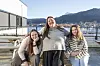 GLER SEG: Journalistane Liv Lilleslett (f.v.), Marthe Macody Tufte Lund og Sara Haizoune håpar den nye podkasten slår godt an på Tysnes. (Begge foto: Randi Kleppe)