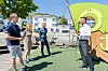 PENGEDRYSS: Sparebanken Vest delte i sist veke ut midlar frå banken sitt eldsjelfond til leikeplass-prosjektet i Våge og prosjektet med sherpasti til Tysnessåto. Frå venstre: Patrick Russell Madsen, som representerte leikeplassen, Merete Fjelltveit Flakke og Per Ingolf Økland i Venelaget Tysnessåto og Olav Hovland i Sparebanken Vest.