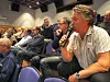 E39 OG BÅRDSUND: Thore Lunde (med mikrofonen) kom med innspel på korleis vegen bør leggjast i terrenget når E39 skal kryssa Bårdsund. Jan Rivenæs (t.v. for Lunde) var tydeleg på at Bårdsund må kryssast med tunnel.
