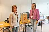 RØYSTELOKALE: Valmedarbeidar Frid Kristiansen og valansvarleg i kommunen Tonje Aakre møtte «Tysnes» ved valurna i Grendatun.