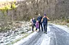 I UBALANSE: På denne plassen, kjent som «Gråsteinen» på folkemunne, sklir bilar ofte av vegen når dei må ryggja for møtande trafikk på grunn av is og feil dosering på vegen, fortel dei fastbuande i Solheimsdalen. F.v. Sven Tommy Pedersen med Emilia (1 ½) på armen, Vanessa (6), Hans Tore Brekke og Magne Skartveit, som freistar å demonstrera hellingsgraden til vegen. (Alle foto: Randi Kleppe)