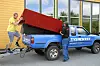 TRIVST SOM FRIVILJUG: Erlend Tvedt og Bjarte Frugård er allereie i sving med arbeid til Tysnesfest. Her ber dei inn møblar som skal vera i garderobane til årets artistar.