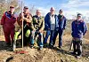 HER SLO LYNET NED: Svein Aga (frå venstre), Olav Laukhamar, Henry Tollaksen, John Laukhamar, Egil Meland og Johannes Skorpen samla på og ved stubben etter den store grana der lynet slo ned og øydela uthuset. No er tømmeret nytta til nytt hus, laga på dugnad.