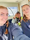 BERGA TURIST: Gøril Rullestad Glesnes og Christina Korsnes ved Alsaker Fjordbruk sørgde for at Fu Xinlong (75) fekk ein topp dag då han ved ein glipp gjekk av snøggbåten på Malkenes i staden for Rosendal.