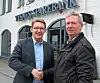 RINGER MED BJELLA: Banksjef Dag Sandstå (t.v.) og styreleiar Leif Magne Hovland markerer klokka ni måndag at Tysnes Sparebank er på børs. (Foto: arkiv)