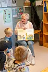 LESESTUND: Målet med Leseløftet-ordninga er å auka leselysta og sikra ein betre balanse mellom bok og skjerm for dei yngste. Her frå ei høgtlesing med Bente Raknes i Lunde barnehage i 2024.