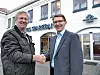 SATSAR: Styreleiar Leif Magne Hovland (tv) og banksjef Dag Sandstå gratulerer kvarandre med banken si nye satsing.