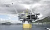 SPENNINGSMOMEMT: Det er berre 20 meter klaring når gigantplattforma passerer høgspentlinene i Langenuen som går over til Tysnes. (Skjermdump: Statoil-film/Video: Statoil)