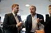 PÅ STORD: Ordførar Kåre Martin Kleppe i samtale med fylkesmann Lars Sponheim for Sunnhordlands-kommunane sitt felles formannskapsmøte på Stord i dag, fredag. – Eg er ikkje her for å prøva å overbevisa dykk om noko de ikkje vil, sa Sponheim om kommunesamanslåing.
