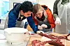 KJØT: Elevane ved valfaget Friluftsliv ved Tysnes skule fekk prøva seg på noko heilt utanom det vanlege, nemleg partering av hjort. Benjamin Hagen og Knut Benjamin Dalland Nesse var blant elevane som gjekk ivrig i gang med arbeidet.