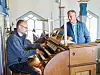 STRÅLANDE NØGDE: Orgelbyggjar Johannes Buder og leiar i Tysnes kulturkyrkje, Hans Tore Brekke, gler seg over den nye orgellyden i Onarheim kyrkje.