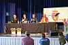 SÅ STOR: Finn Tokvam (nr. to frå høgre) demonstrerer storleiken på noko til talkshow-vertane Anders Dalland (t.v.) og Kåre Martin Kleppe. Ragnar Hovland til høgre.