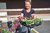 FARGERIKT: Linn Frøkedal viser fram blomane som vart planta ut i Våge sentrum nyleg. (Alle foto: Liv Lilleslett)