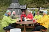 GODE LAPPAR: God stemning kring bordet. Frå v: Ketil Skjolde, Lena Grønstøl, Ann Helen Helland, Anne-Britt Onarheim, Eirik Onarheim og Beate Storesætre. Anne-Britt hadde steikt lappar, og delte rundhanda ut.
