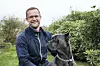 SNUDDE LIVET: Lars Leknes Auran kjente lenge på skamma over fortida og rusmisbruket, og det tok tid før han igjen kunne gå med hovudet heva på Tysnes. No smiler livet, og han trivst godt i huset på Teigland. Her saman med hunden Poker. (Foto: Ingunn Gjærde)