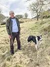 REST AV VEGEN: Oppover bak Brynjulf og nabohunden «Marsco» ser ein tydeleg kor Prestevegen gjekk over Dalland.