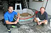 INVITERTE TIL DUGNAD: F.v. Trond Bakkane og Steinar Rosset inviterte fredag til brunsnigeldugnad i Uggdal. I midten ser ein blandinga som tek knekken på sniglane.