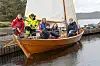 TRE GENERASJONAR: «Tysnes» møtte tre generasjonar med aktive oselvarsiglarar. Frå venstre: Kristoffer Gjerstad, Andreas Gjerstad Kleppe, Kristin Teigland Gjerstad Kleppe, Bernhard Gjerstad, Victoria Gjerstad og Vegard Gjerstad Kleppe. Båten er «Glimt», som Bernhard kjøpte for 65 år sidan.