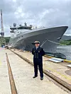 12. juni fekk det siste kystvaktskipet i Jan Mayen-klassen namnet KV Hopen. Skipssjefen hadde, som ein ser, kledd seg reglementert på dåpsdagen. Foto: Forsvaret