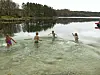 FORFRISKANDE: Femteklasse ved Tysnes skule tok seg i dag ein dukkert i sjøen ved småbåthamna på Gjerstad.