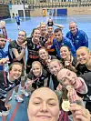 I SENTRUM: Snuoperasjonen i kampen mot NTNUI gjorde 16 år gamle Iselin Nilsen til den store helten i Førde-kontingenten. Her er ho midt i gjengen med drakt nummer 2, etter at seriemeisterskapet var eit faktum.