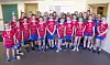 NYE DRAKTER: Sju av laga til Tysnes idrettslag har fått nye drakter. Søndag spelte både Jenter 15, Jenter 14 og Gutar 12 i dei nye draktene i Tysneshallen. (Foto: Morten Haaland)